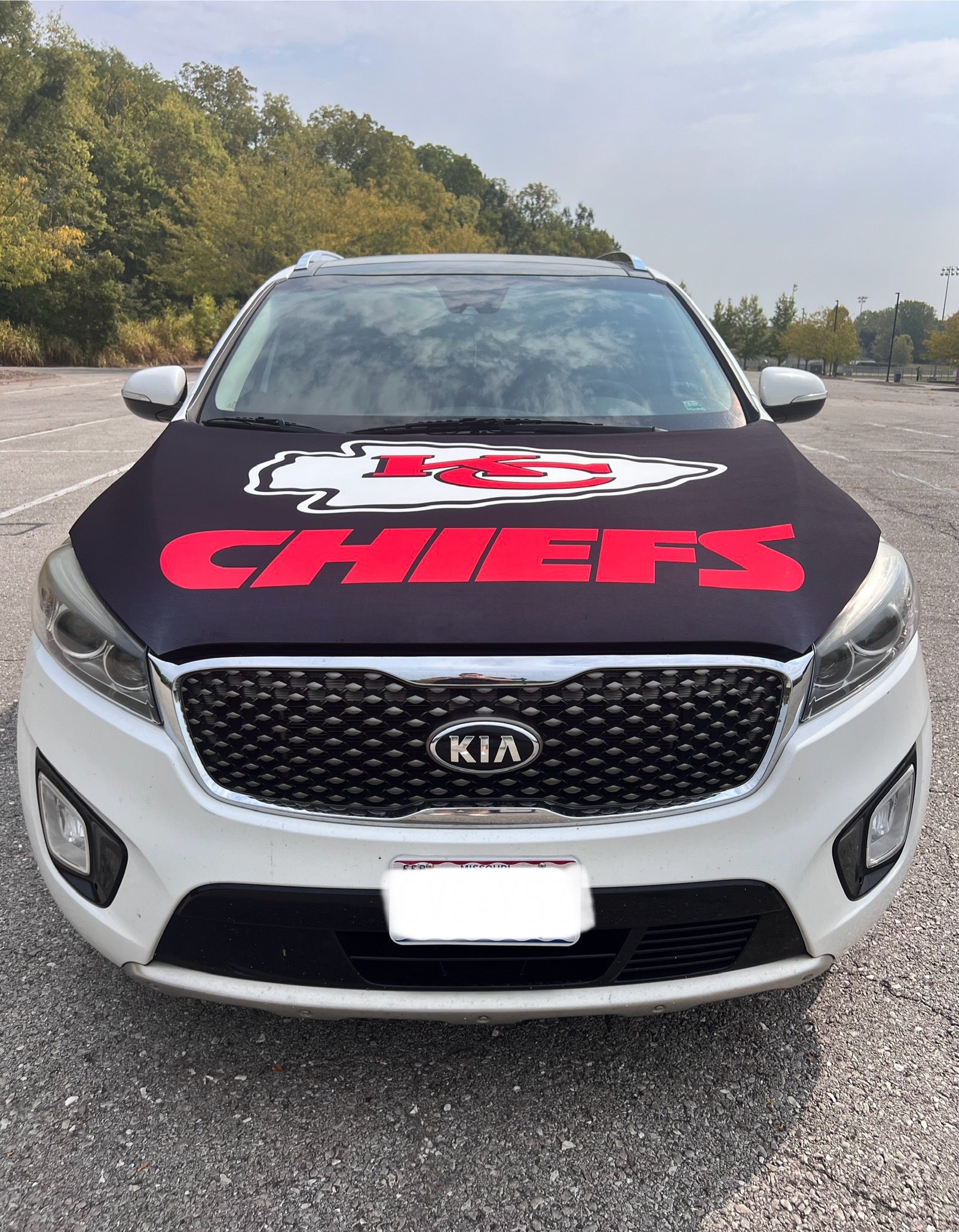 Newly released Chiefs design as of September 2024! Made with stretchy polyester material, this completely removable hood cover fits snug around all standard size truck, van, SUV or sedan hood types. Excluding extremely small hood types. Includes 2 clip straps that attach underneath the hood for a tight fit therefore it will sustain against highway speeds without shifting. The cover can easily be applied to your hood in under 2 minutes! No tools needed. It can be kept on during inclement weather including rain, hail, snow and high winds.